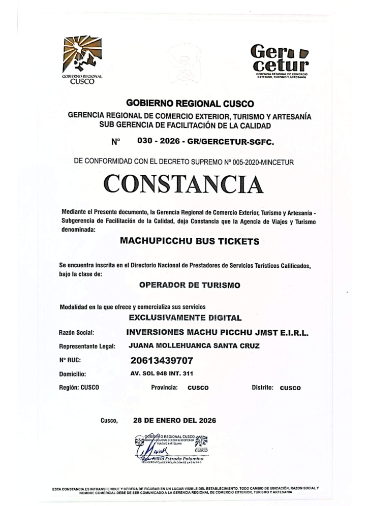 Official operator certified by GERCETUR to provide tourism services in the region.